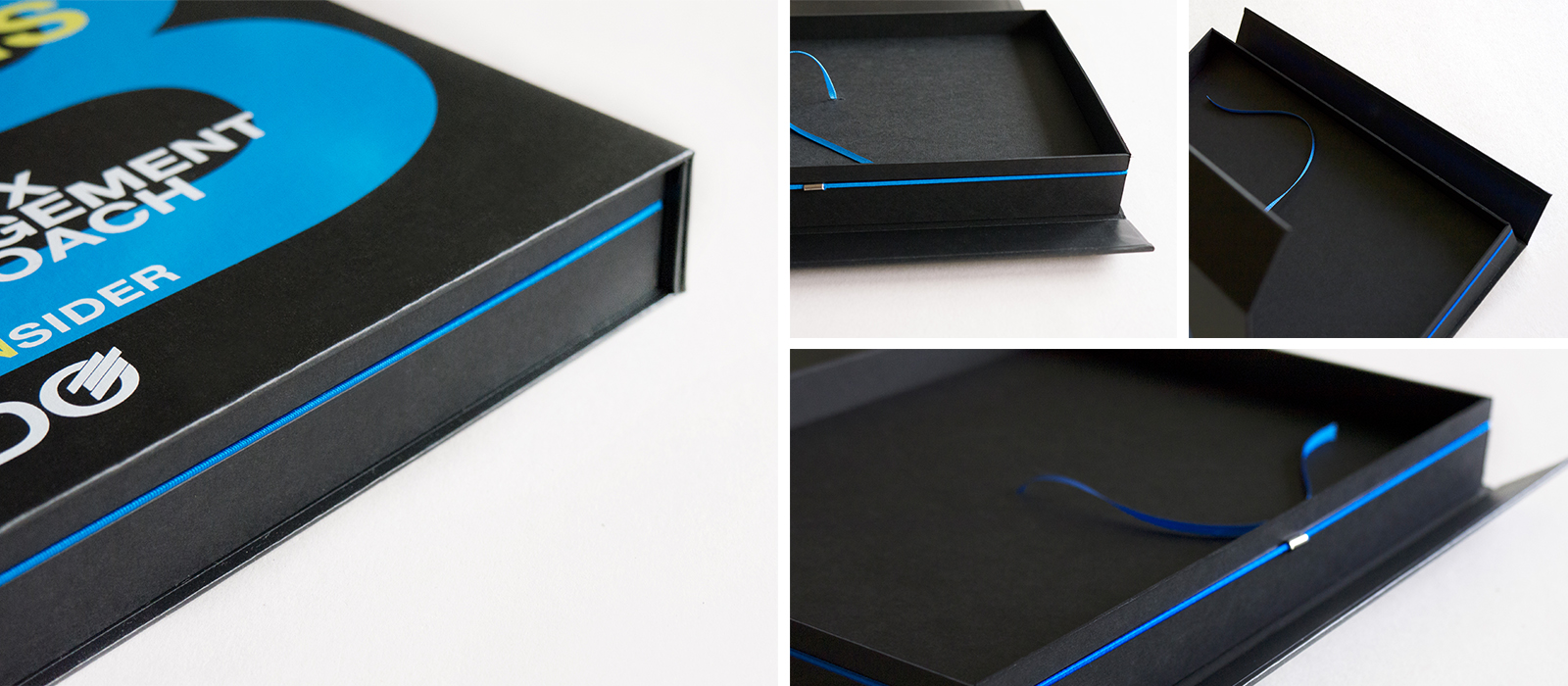 Fadengeheftete Hardcover mit blindgeprägter und siebbedruckter Decke und Tasche auf U3 in gestanztem Schuber mit Stoffapplikationen und Schnürverschluss